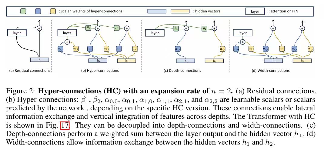 Hyper Connections 的结构如下图(b)所示。该方法引入了两种可学习的连接机制:深度连接(Depth-Connections)和宽度连接(Width-Connections)。