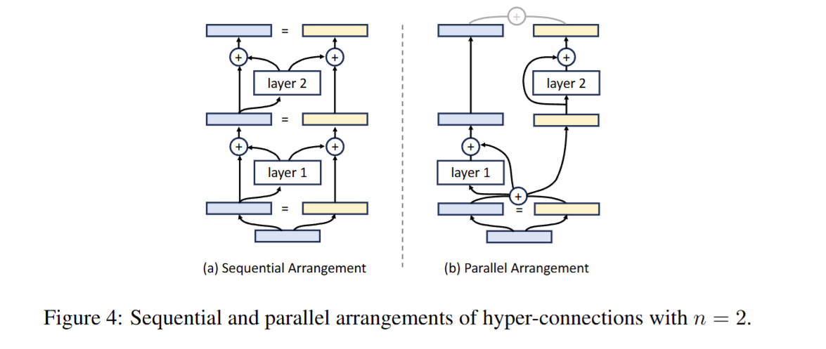 Hyper Connections可以学习将不同层重排列,形成顺序排列或并行排列的混合结构