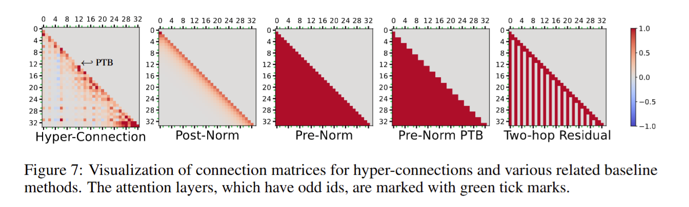 - Hyper Connections 显示出一种大致形连接模式,即每层输出对邻近层的贡献较大,同时浅层对远层有长期贡献。这种模式融合了 Pre-Norm 和 Post-Norm 结构的特性。